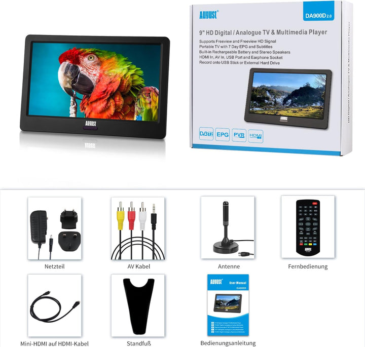 - Tragbarer 9“ Zoll (22,9cm) DVB-T2 Fernseher - Geniessen Sie alle öffentlich rechtlichen und frei empfangbaren HD Sender im 16:9 Format und in bester Bildqualität. Völlig kostenlos und in fast ganz Deutschland. Sie benötigen kein Internet-Datentarif