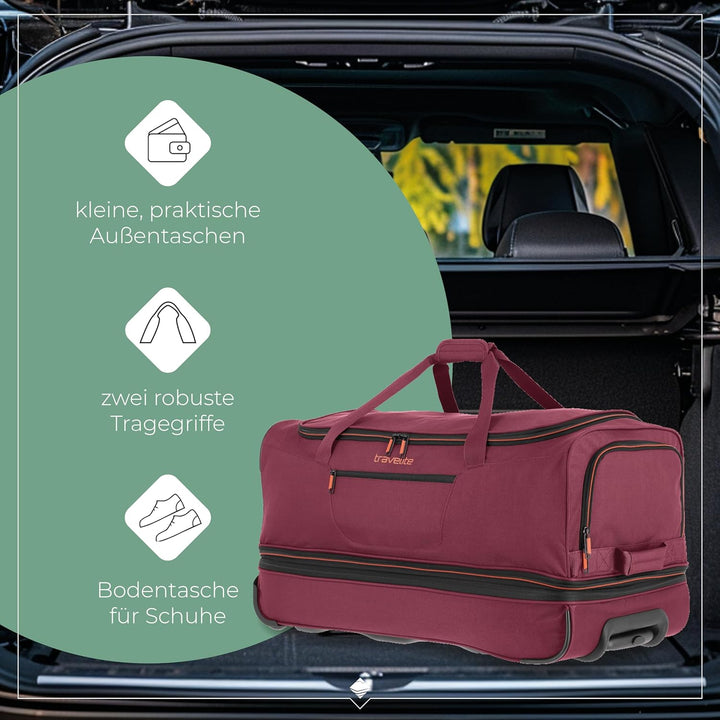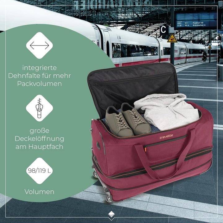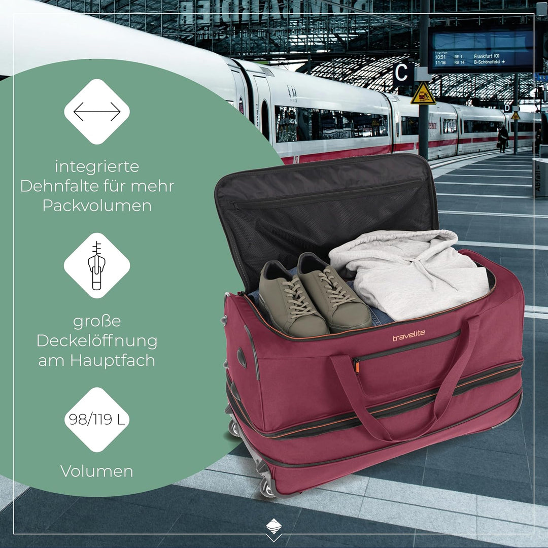 - LIEFERUMFANG: 1 x Rollenreisetasche mit 2 Rollen; Masse 38 x 70 x 37 cm; Volumen 98 Liter (durch Dehnfalte erweiterbar auf 119 Liter); Gewicht 2,8 kg; Material Polyester; Farbe Bordeaux (Weinrot)