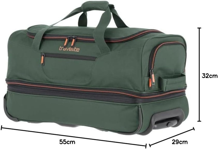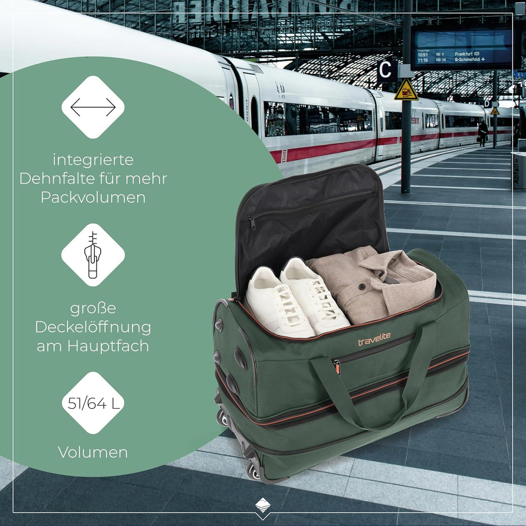 - LIEFERUMFANG: 1 x Rollenreisetasche mit 2 Rollen; Maße 32 x 55 x 29 cm; Volumen 51 Liter (durch Dehnfalte erweiterbar auf 64 Liter); Gewicht 2,3 kg; Material Polyester; Farbe Dunkelgrün
