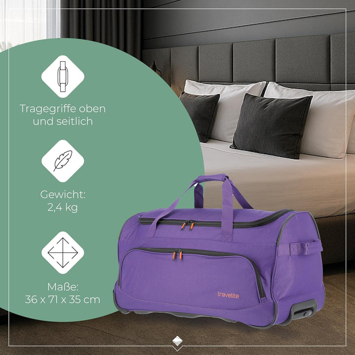 • LIEFERUMFANG: 1 x Rollenreisetasche mit 2 Rollen; Maße 36 x 71 x 35 cm; Volumen 89 Liter; Gewicht 2,4 kg; Material Polyester; Farbe Lila
