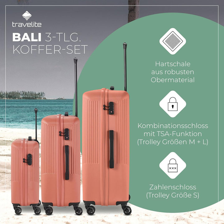 - BALI: Mit der travelite Koffer Kollektion BALI kommt bei dir garantiert noch mehr Urlaubsfreude auf. Die stabile ABS Hartschale im modernen Design überzeugt durch seine hohe Stabilität und bietet viel Sicherheit auf allen Reisen