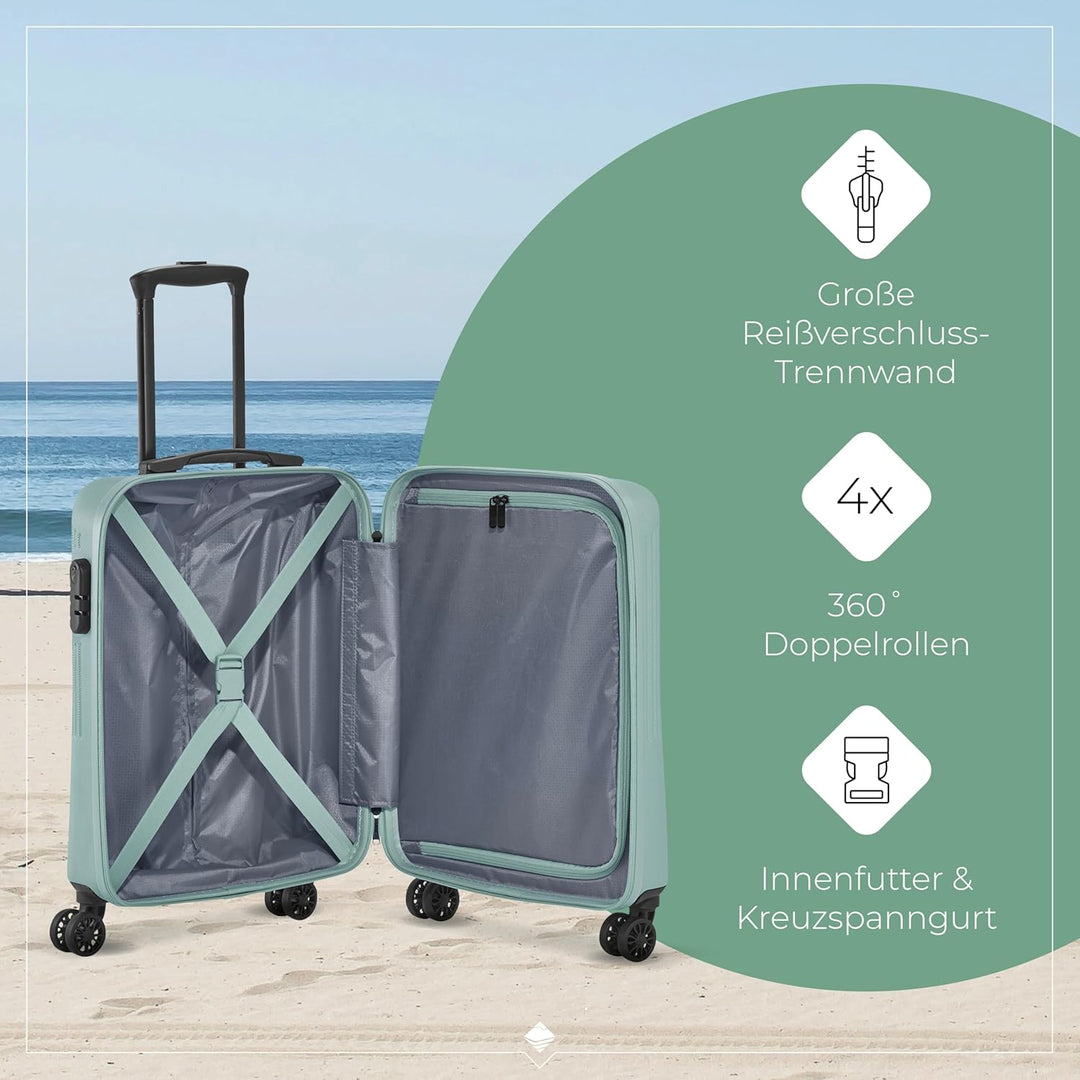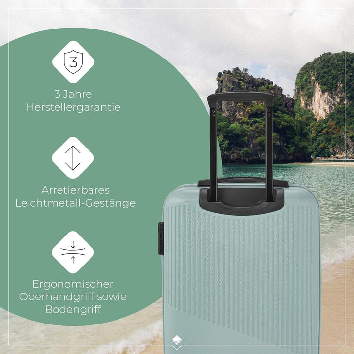 - LIEFERUMFANG: 1 x Handgepäckkoffer Grösse S Masse: 55 x 39 x 20 cm erfüllt IATA Norm; Volumen 34 Liter; Gewicht 2,5 kg; Material ABS; Farbe Mint (Türkis); mit Kombinationsschloss