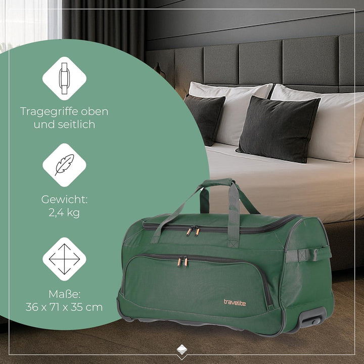 - LIEFERUMFANG: 1 x Rollenreisetasche mit 2 Rollen; Masse 36 x 71 x 35 cm; Volumen 89 Liter; Gewicht 2,4 kg; Material Polyester; Farbe Dunkelgrün