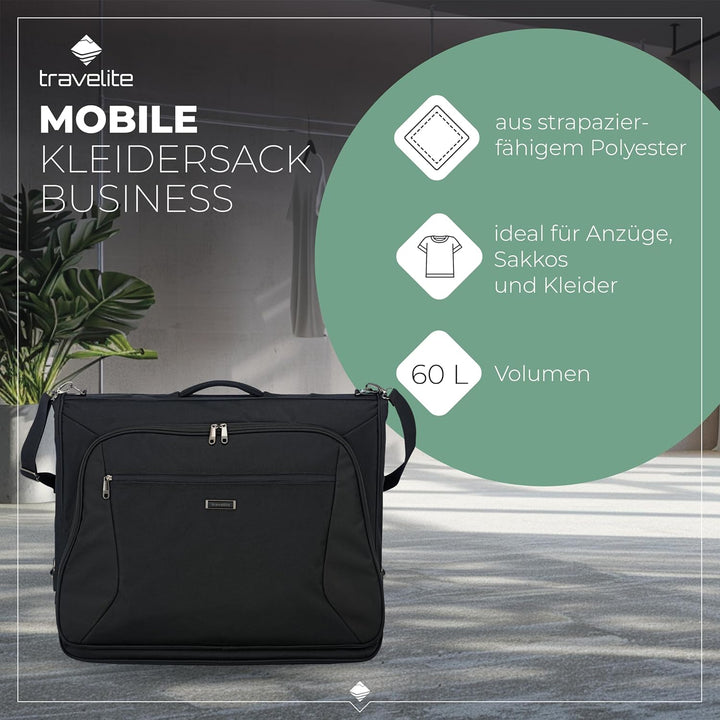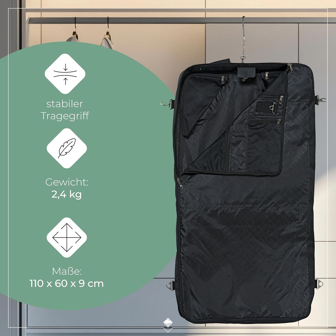 - LIEFERUMFANG: 1 x Kleidersack Anzug BUSINESS; Masse: 110 x 9 x 60 cm; Volumen: 60 Liter; Gewicht: 2,4 kg; Material: Polyester; Farbe: schwarz