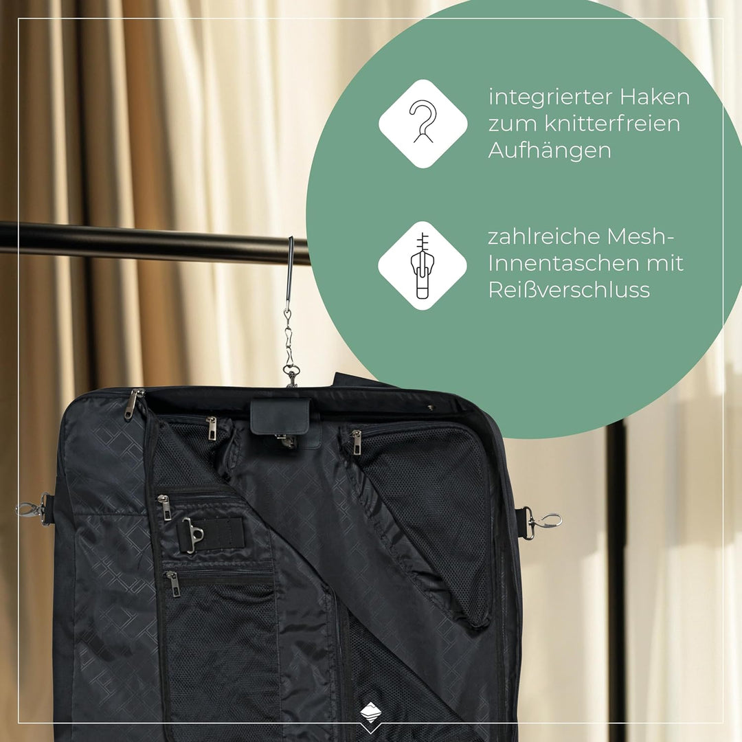 - MOBILE: Klassisch-eleganter und leicht faltbarer Kleidersack aus robustem und wasserabweisendem Polyester, einem abnehmbaren Schultergurt, einer Aufsteckfunktion für Ihren Koffer und einem Haken zum Aufhängen