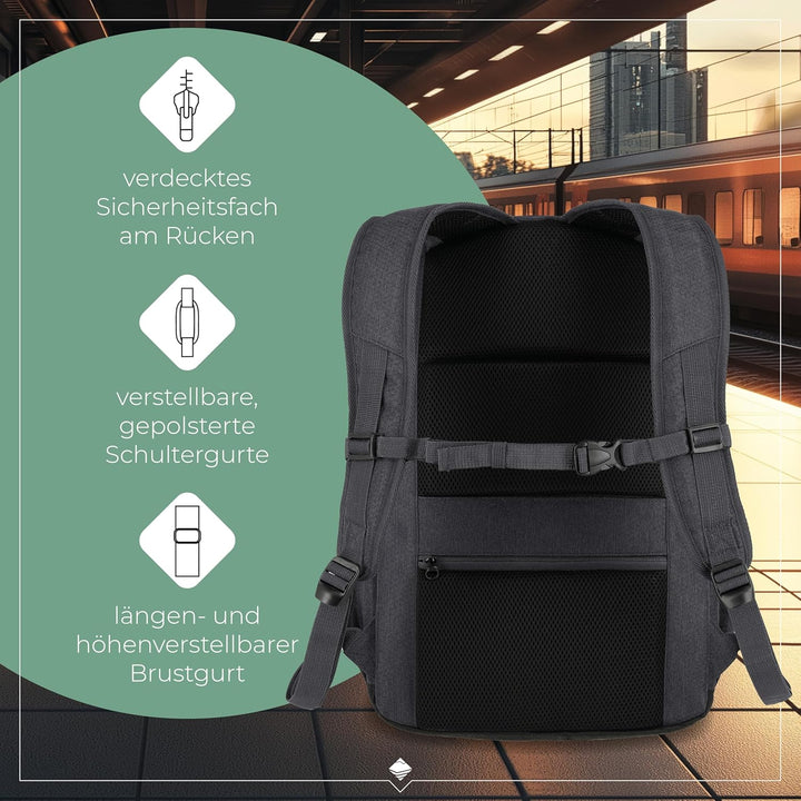 - INNENLEBEN: Der Rucksack bietet eine grosse Vortasche mit Organizer, zwei Haupt-Reissverschlussfächer, ein verdecktes Rückenfach, zwei seitliche Taschen für bspw. Trinkflaschen und ein gepolstertes Laptopfach für herkömmliche Laptops bis 15,6 Zoll