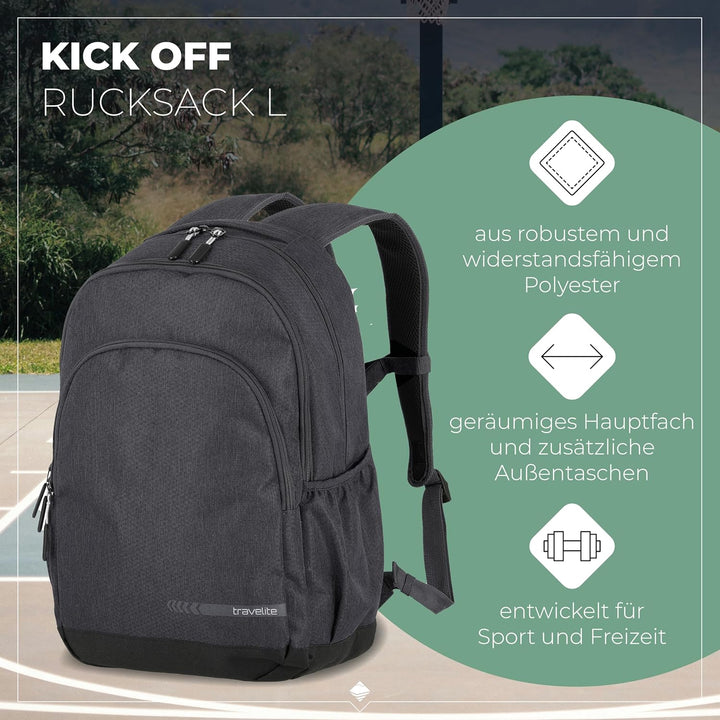 - KICK OFF: Der für Sport und Freizeit entwickelte Rucksack aus robustem Polyester hat zwei gepolsterte und verstellbare Schultergurte und einen höhen- und längenverstellbaren Brustgurt für angenehmen Tragekomfort