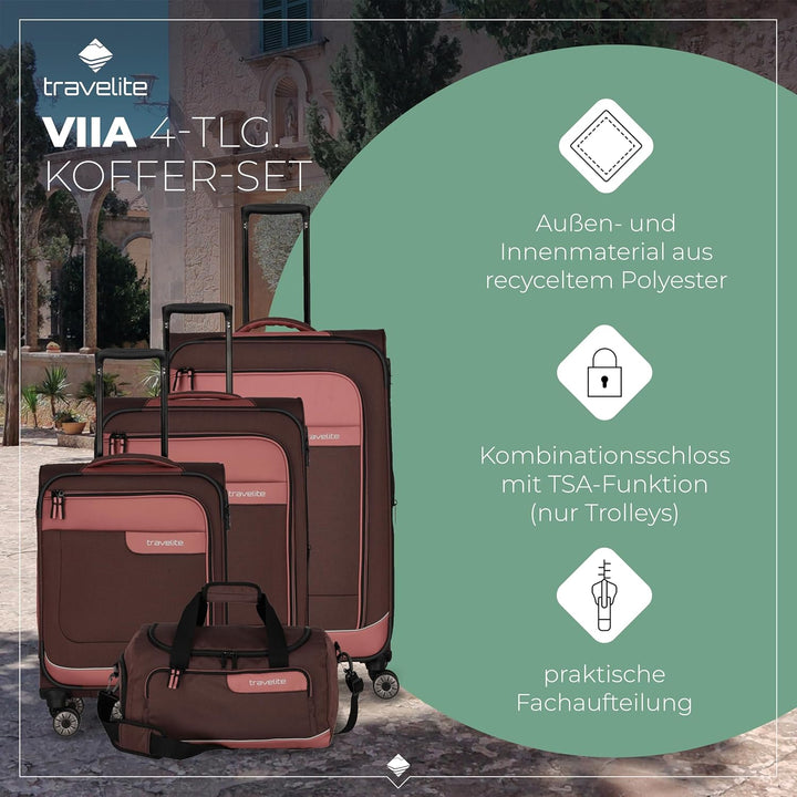 - VIIA: Nachhaltig unterwegs - die Weichschale und das Innenfutter der Rollkoffer Serie inklusive Reisetasche besteht zu 100% aus recyceltem Polyester. Der kleine Reisekoffer kann bei vielen gängigen Fluggesellschaften mit an Bord genommen werden