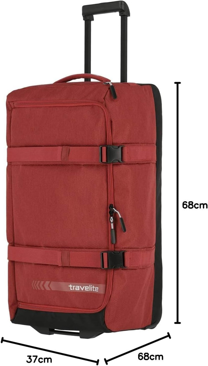 - Produkt 1: LIEFERUMFANG: 1 x Trolley Reisetasche mit Rollen Grösse L; Masse 68 x 37 x 26 cm; Volumen 65 Liter; Gewicht 2,7 kg; Material: Polyester; Farbe: Rot