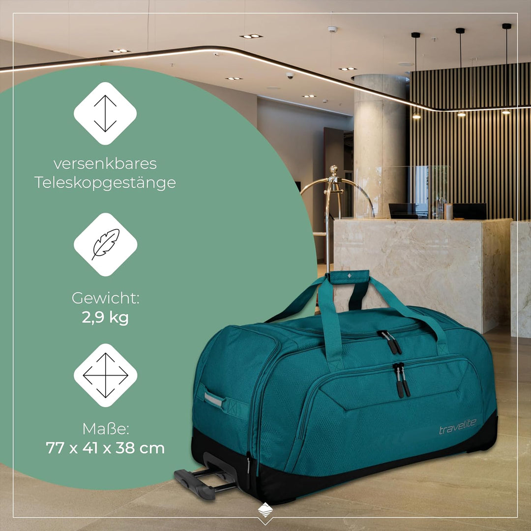 - LIEFERUMFANG: 1 x Trolley-Reisetasche mit Rollen Grösse XL, Masse 77 x 41 x 38 cm, Volumen 120 Liter, Gewicht 2,9 kg, Material: Polyester, Farbe: Petrol (Türkis)