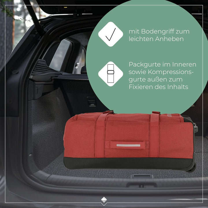 • LIEFERUMFANG: 1 x Trolley Reisetasche mit Rollen Grösse L; Masse 68 x 37 x 26 cm; Volumen 65 Liter; Gewicht 2,7 kg; Material: Polyester; Farbe: Rot