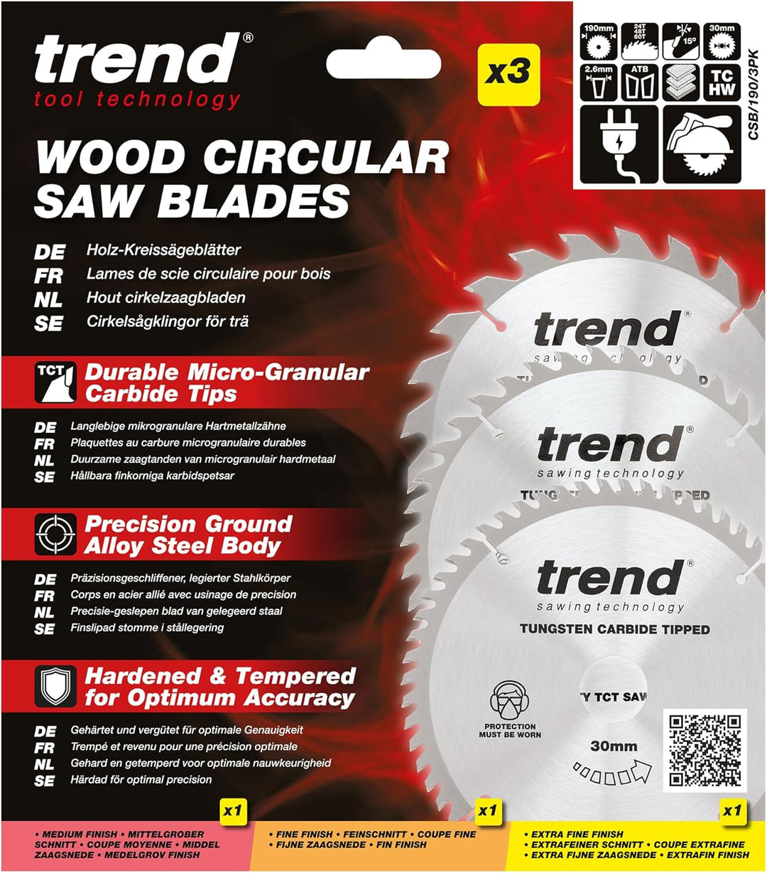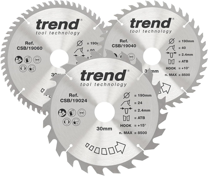- HOCHLEISTUNGSKLINGEN: Die Trend Sägeblätter sind leistungsstarke Klingen mit mikrogranularen Wolframkarbid-Spitzen für optimale Kantenhaltbarkeit und Schnittqualität in verschiedenen holzbasierten Materialien.