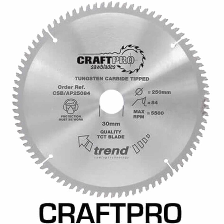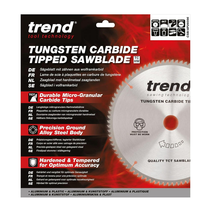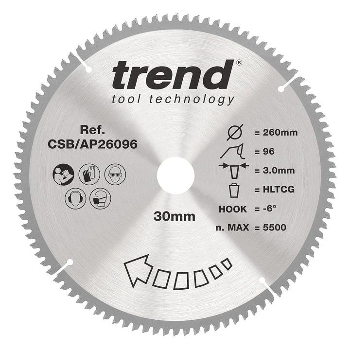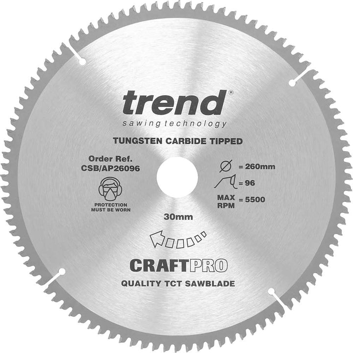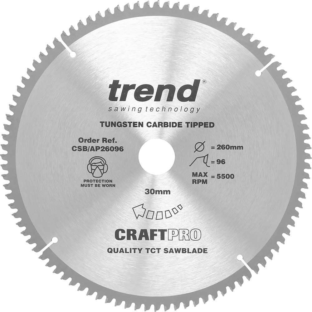 Trend CraftPro Arbeitsplatte Aluminium und Kunststoff TCT Kreissägeblatt, 260mm Durchmesser x 96 Zäh