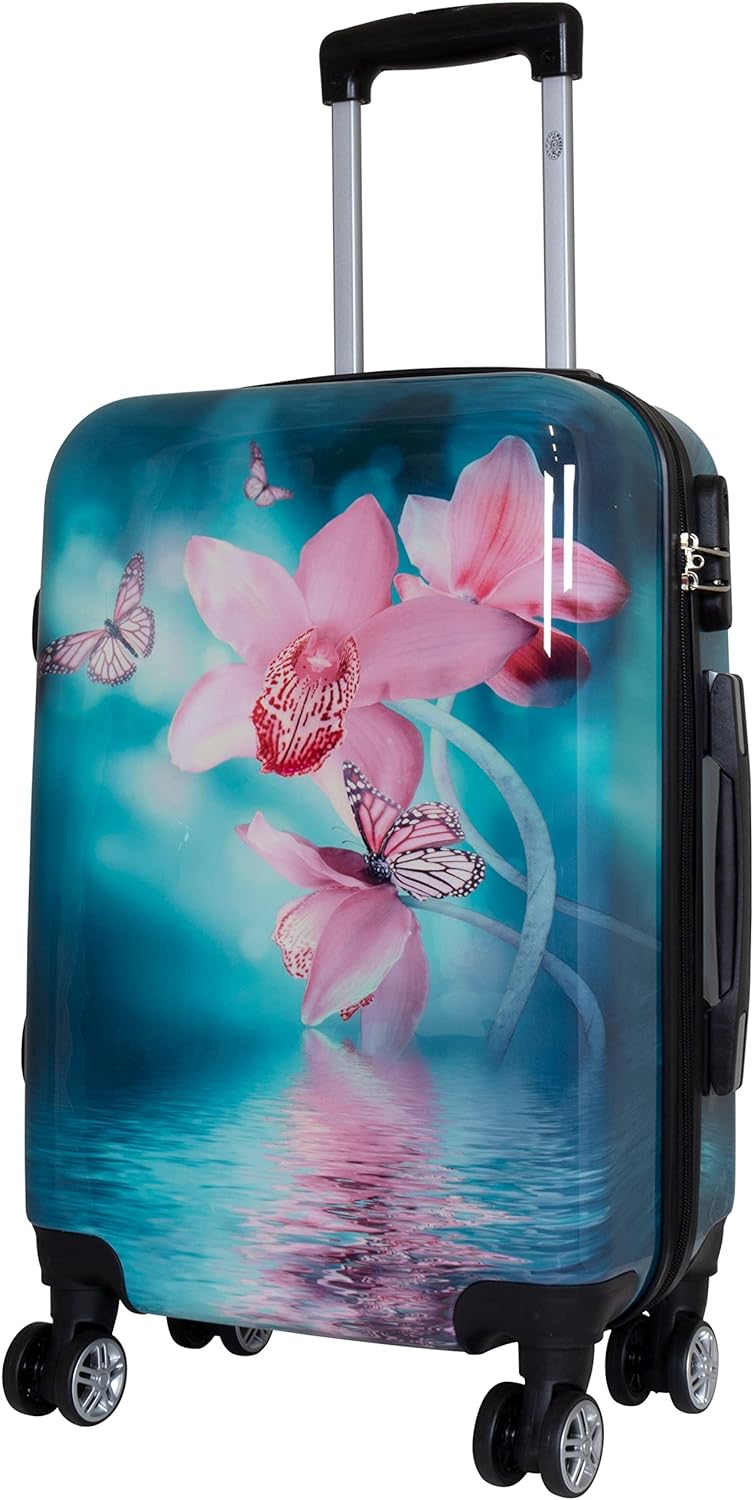 - bedruckter Hartschalenkoffer mit Blumen-Design, Orchideen in rosa / pink und bezaubernde Schmetterlinge auf grünem Phantasie-Hintergrund
