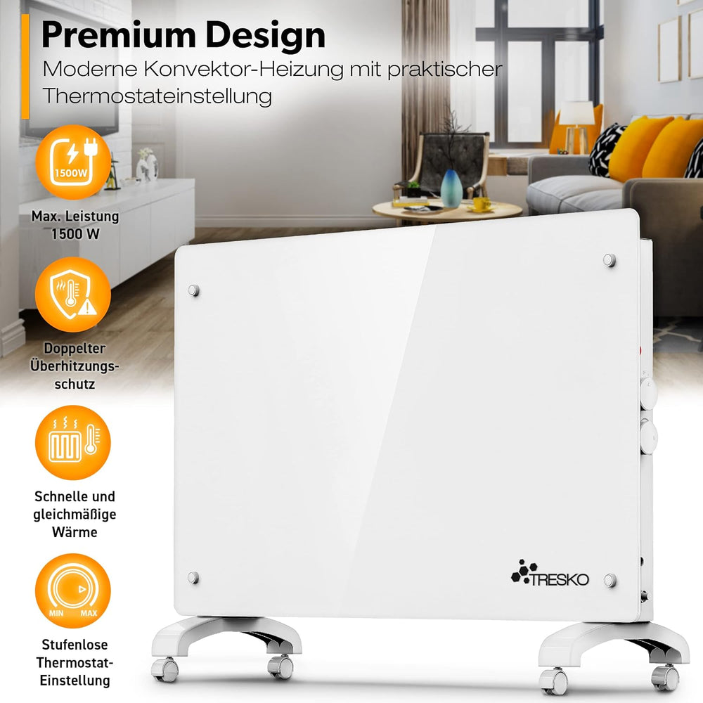 - JETZT ENERGIESPAREND HEIZEN: Der TRESKO Glaskonvektor erwärmt sich dank Konvektionswärme innerhalb weniger Sekunden, dies sorgt für eine optimale Wärme und wonnige Gemütlichkeit auch in grossen Räumen. Die Reflektorwirkung bei diesem Wärmestrahler