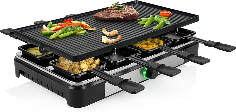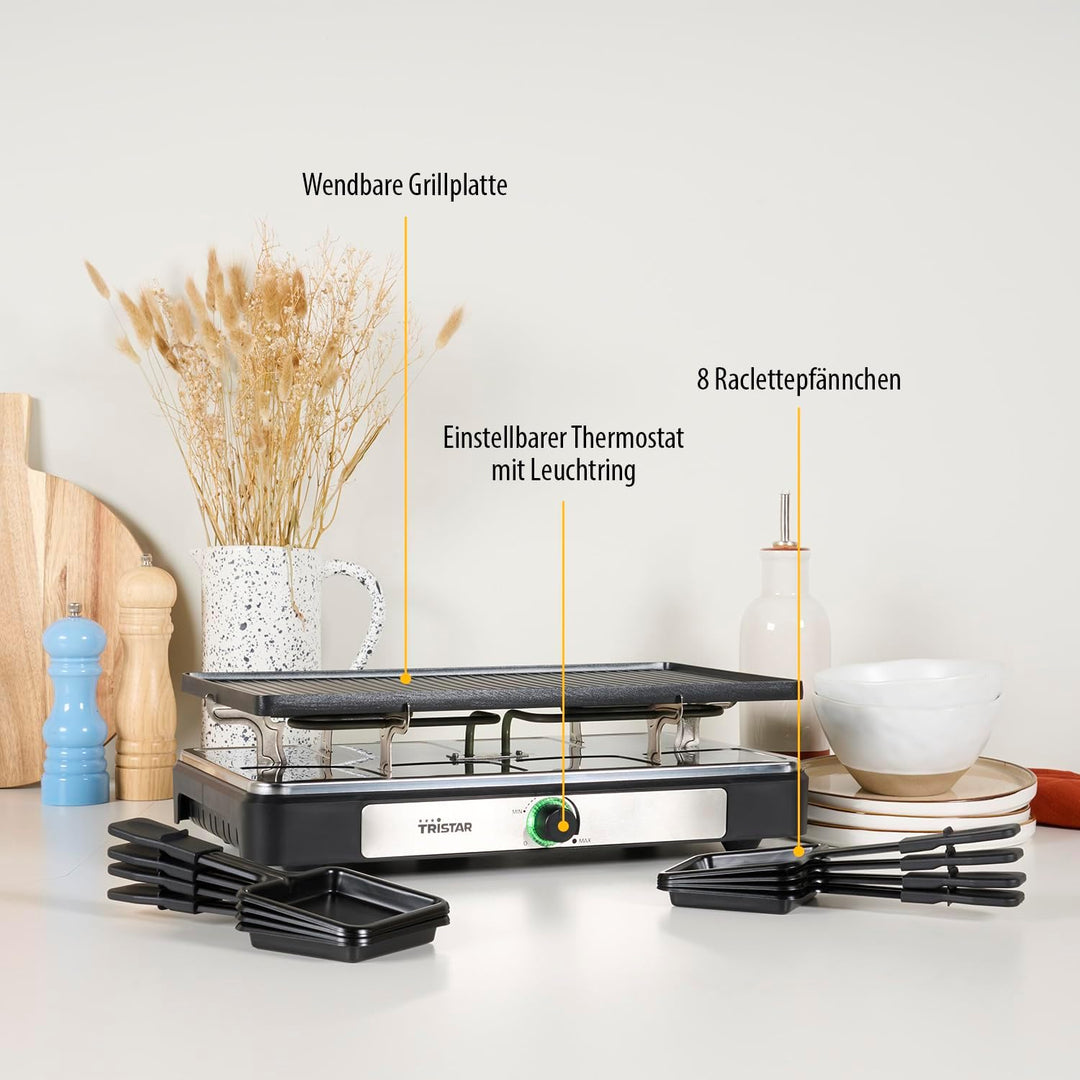 - Entscheiden Sie sich für ein multifunktionales Raclette-Gerät und sorgen Sie für Abwechslung: Das Tristar Raclette verfügt über eine wendbare Grill-/Teppayaki-Grillplatte, damit Sie das ganze Jahr über Grillspezialitäten zubereiten können, so wie