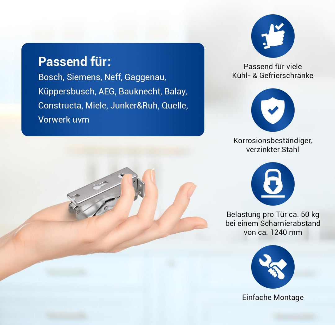 - PASSEND FÜR: Scharnier für Kühlschranktür eignet sich für Geräte von Miele, Bosch, Siemens, Neff, Gaggenau, Küppersbusch, AEG, Bauknecht, Balay, Constructa, Junker&Ruh, Quelle, Vorwerk uvm