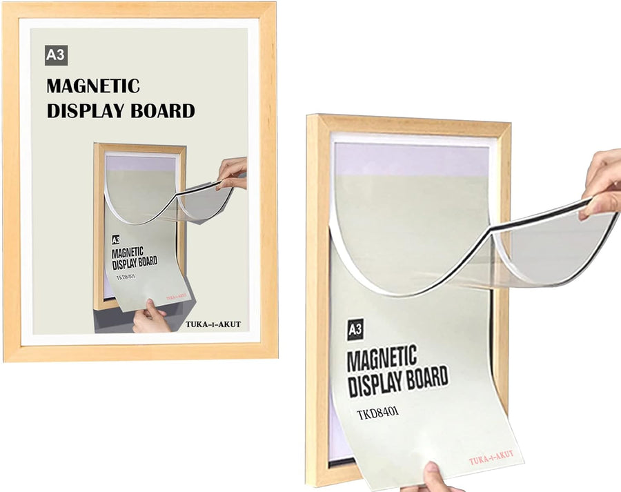 - [ 2er Set ] DIN-A3 Holz Info-Rahmen mit Glasklare Acryl Frontfolie und aufklappbarem Magnetrahmen, für professionelle flexible Präsentation und Schnelles Wechseln von Dokumenten, Aushängen, Bilder, Kunst, Poster, Informationen, Werbung, Angeboten,