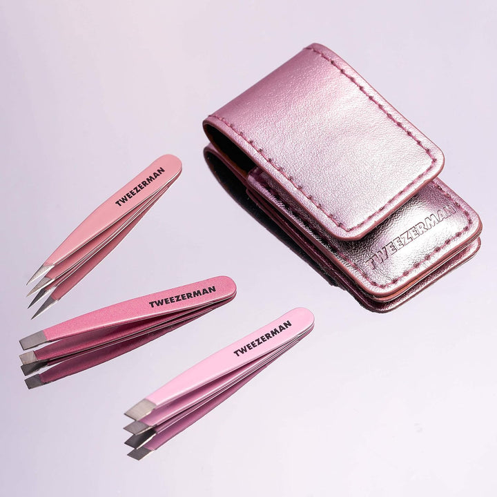 TWEEZERMAN Mini Pinzetten Set, 3 teilig zum Augenbrauenzupfen für Reise und Unterwegs, Pink