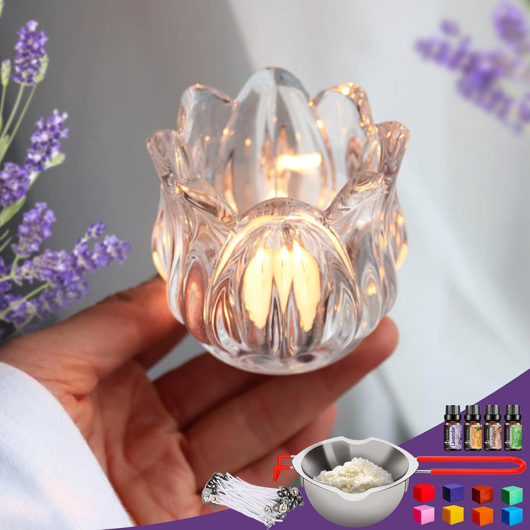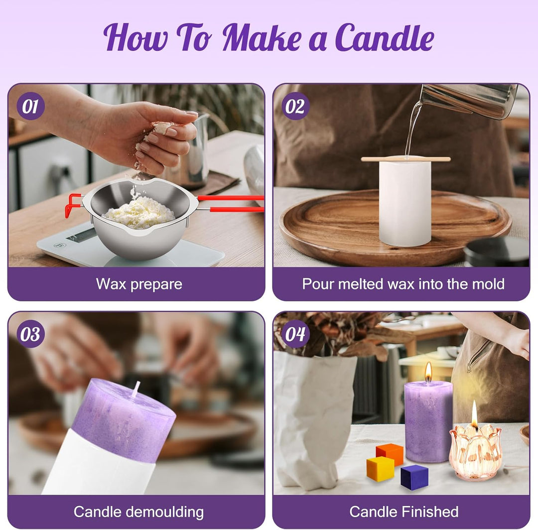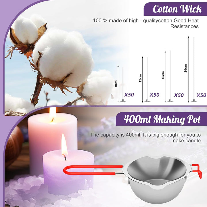 - đŻïžăDIY-KerzenherstellungssetăDas Kerzenherstellung Kit enthĂ€lt einen 400-ml-Kerzentopf,5 * 120g Sojawachs,200 Kerzendochte in vier LĂ€ngen (9/12/15/20 cm),200 Dochtaufkleber,1 MetallrĂŒhrstab,1 V-förmige Schere,2 bunte TulpenkerzenglĂ€ser,10