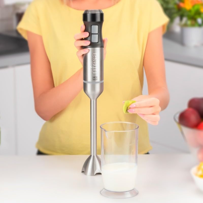 - LEISTUNG UND GESCHWINDIGKEITEN. BPA-freier Minipimer mit 1400 W Leistung, TURBO-Funktion und 20 einstellbaren Geschwindigkeiten für die Verarbeitung aller Arten von Lebensmitteln.