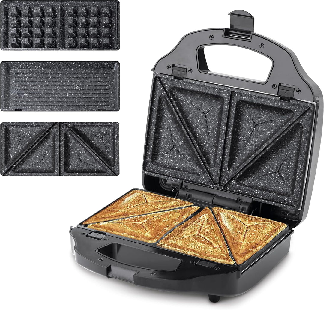 - 3-in-1 Sandwichmaker, 3 austaschbaren Platten für Sandwiches, Waffeln, un Grillplatte für Fleisch, Gemüse, un vieles mehr.