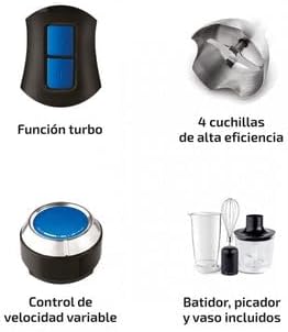 - LEISTUNG UND GESCHWINDIGKEITEN. BPA-freier Minipimer mit 1400 W Leistung, TURBO-Funktion und 20 einstellbaren Geschwindigkeiten für die Verarbeitung aller Arten von Lebensmitteln.