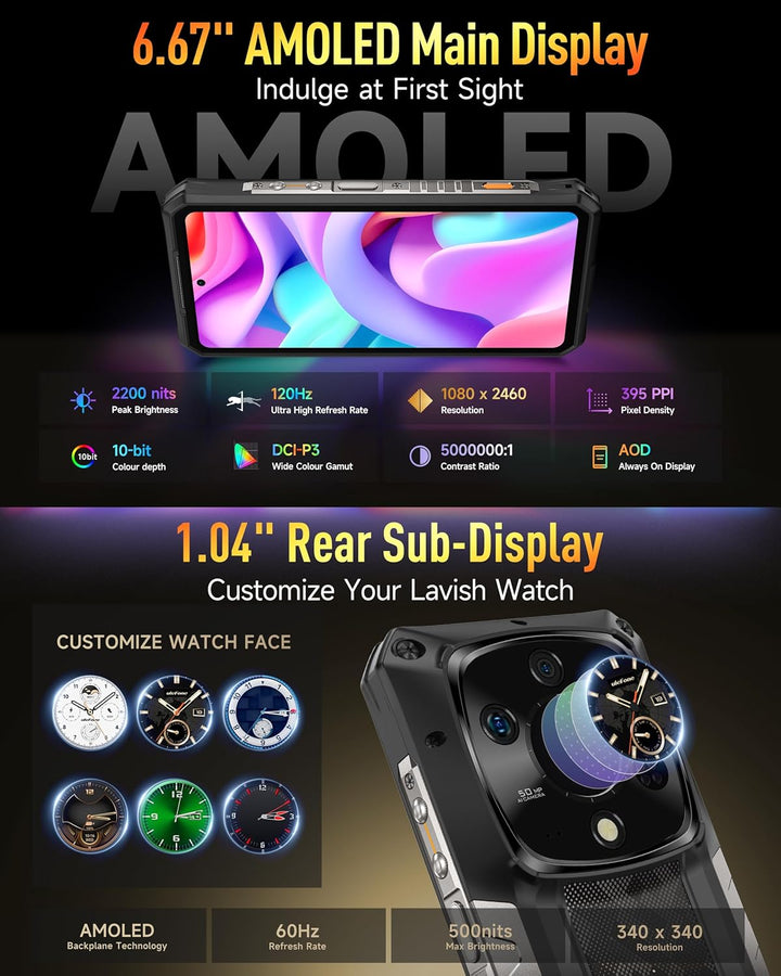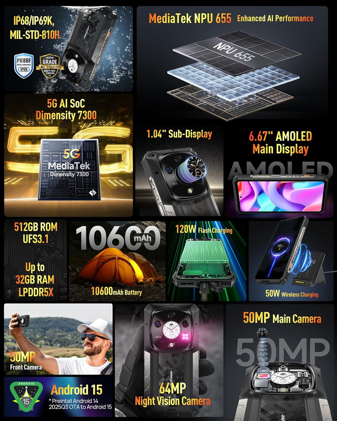 - ✨Flaggschiff-Leistungsmonster: Das ✔️erste robuste KI-Handy, ausgestattet mit ✔️32GB RAM ✔️512GB ultraschnellem Speicher für Rechenleistung ! Es verfügt über ein ✔️6,67" 120Hz 2200nits AMOLED-Display, einen ✔️1,04"