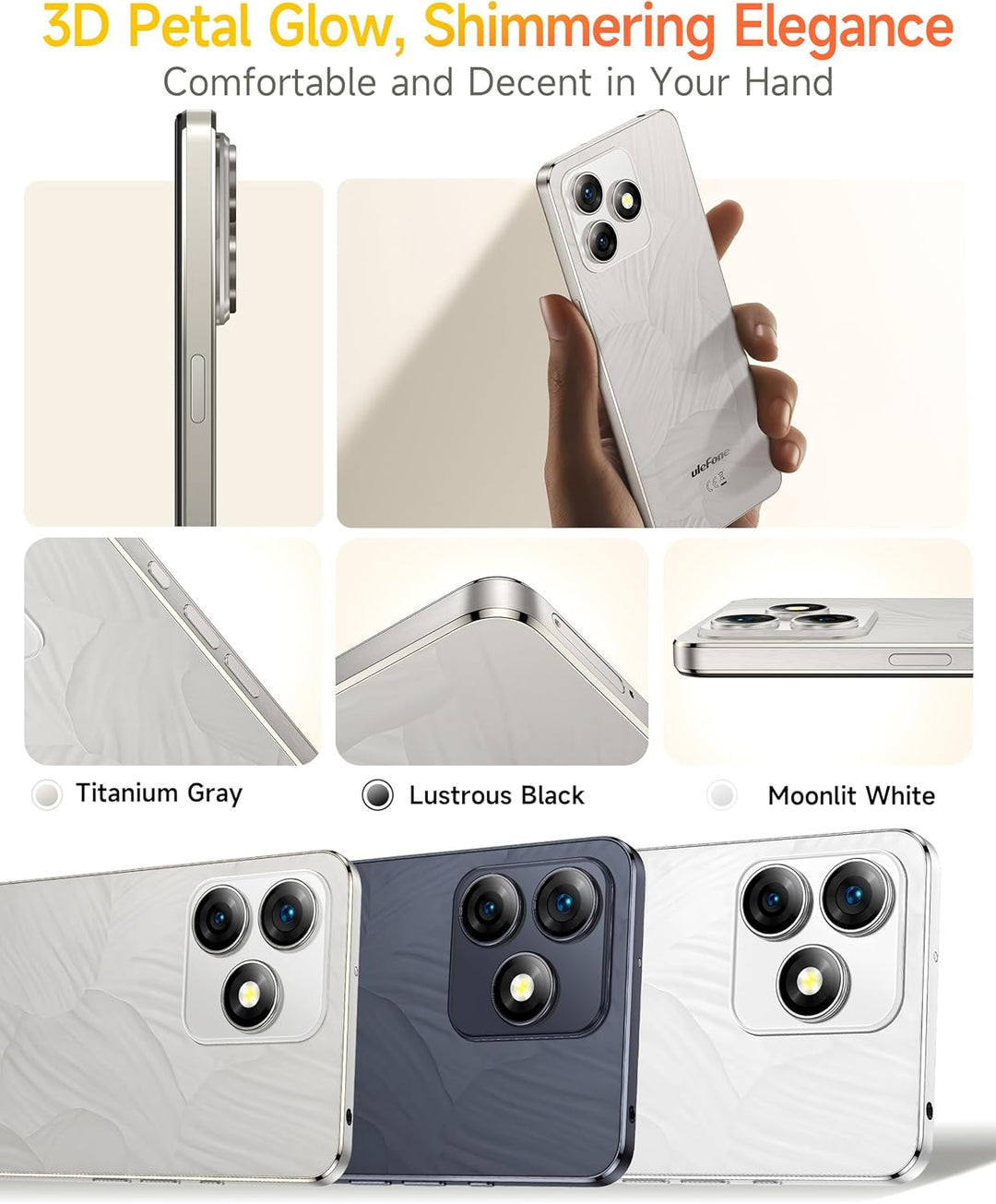 - 3D-Petal Glow, schimmernde Eleganz Komfortabel:Das elegante und jugendliche Design des Ulefone Note 18 Ultra handy, mit seiner 3D Petal Glow Oberfläche, bietet optimalen Komfort in der Hand. Das mit einem 3D Blütenmuster verzierte Rückglas mit AG