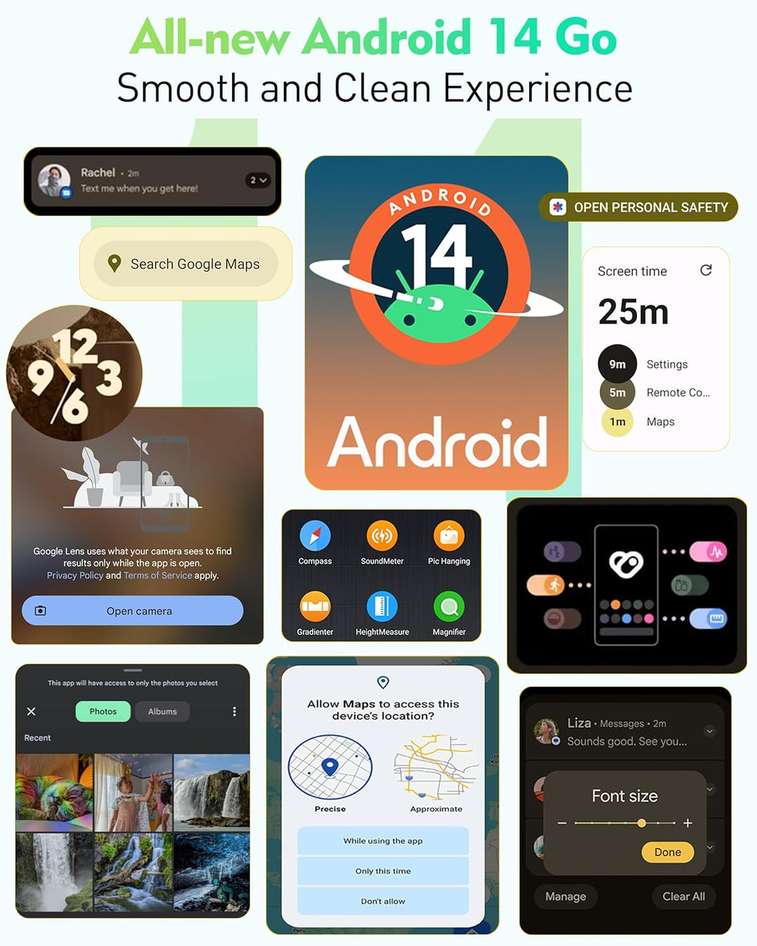 - ✨Android 14 Go: Android 14 Go ist für weniger leistungsstarke Hardware optimiert und bietet im Vergleich zu seinen Vorgängern eine reibungslosere Leistung und schnellere App-Starts. Ausserdem spart es Akkustrom, verlängert die Gerätenutzungsdauer