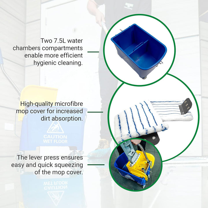 • Dank des 15 Liter Doppelfahreimers mit zwei Wasserkammern, bleibt sauberes und schmutziges Wasser getrennt