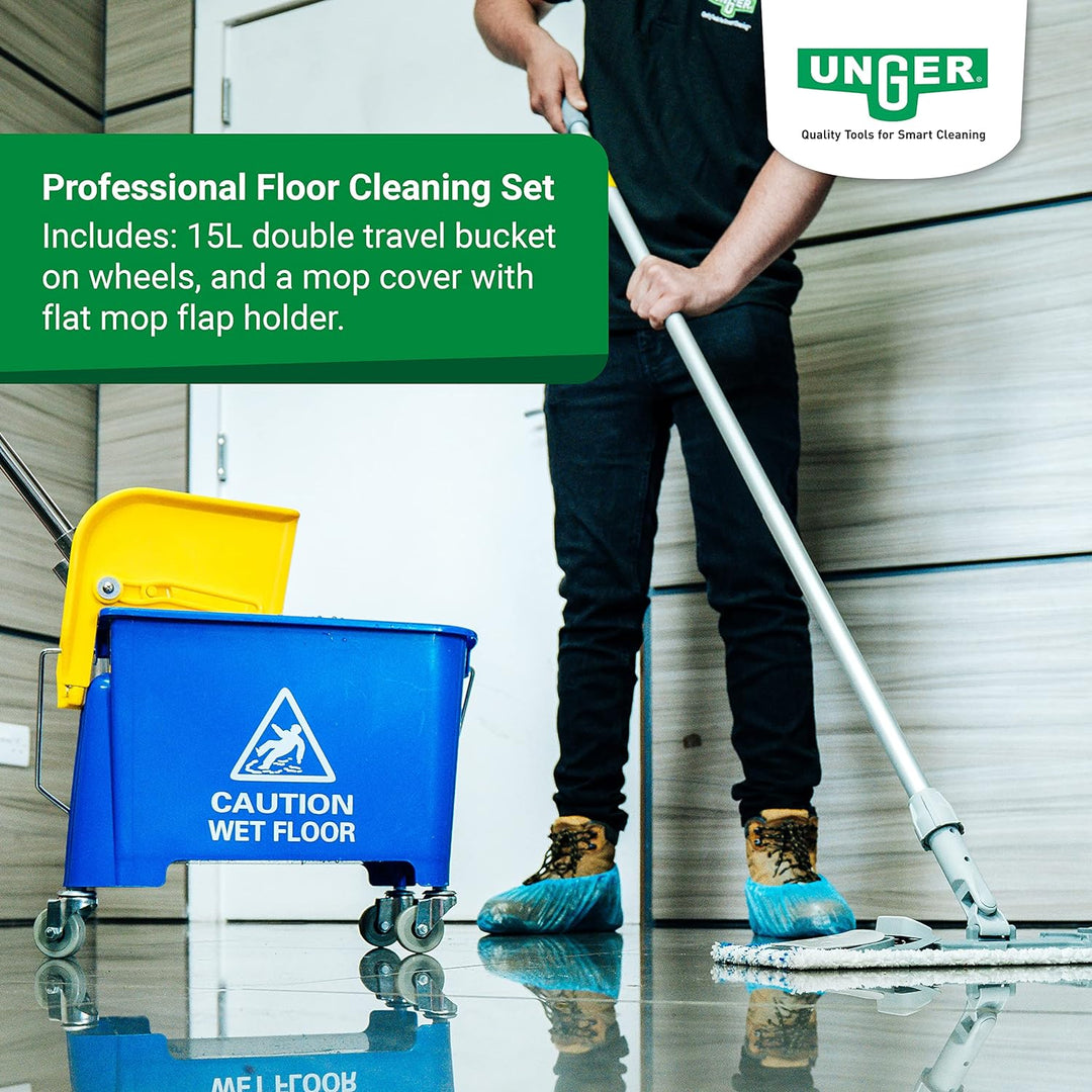 Unger Profi Bodenreiniungs-Set (inkl. Doppelfahreimer 15 L, Mikrofaser-Wischbezug und Flachmopp-Klap