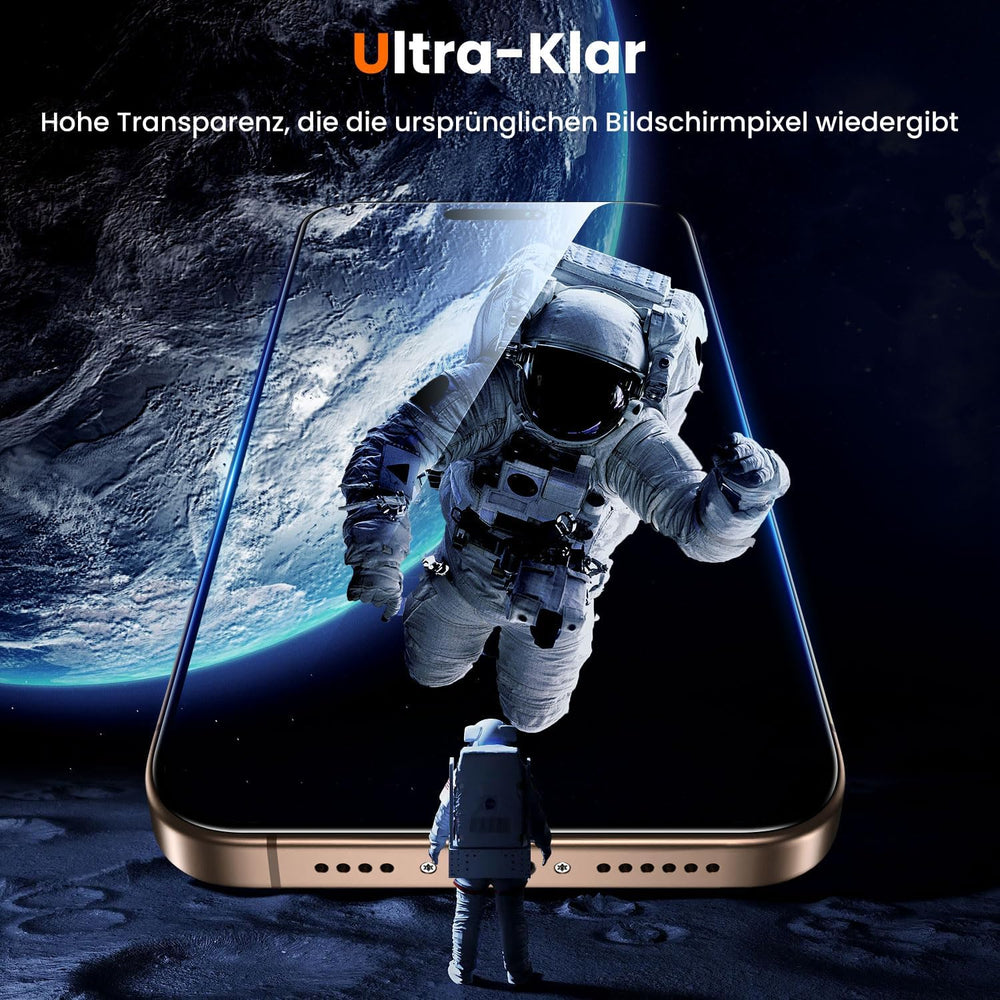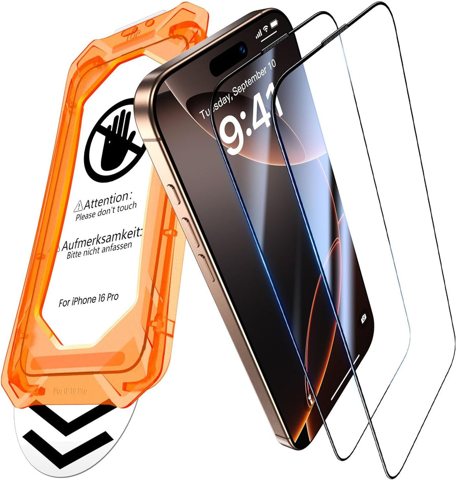 - Keine andere Installation ist einfacher wie unsere: Dank bahnbrechend Vollautomatische Montagerahmen:Die vollautomatische Positionieren & Staubentfernung & Blasenentfernung. Montage iPhone 16 Pro Schutzfolie auf Ihrem Bildschirm dauert weniger als 3