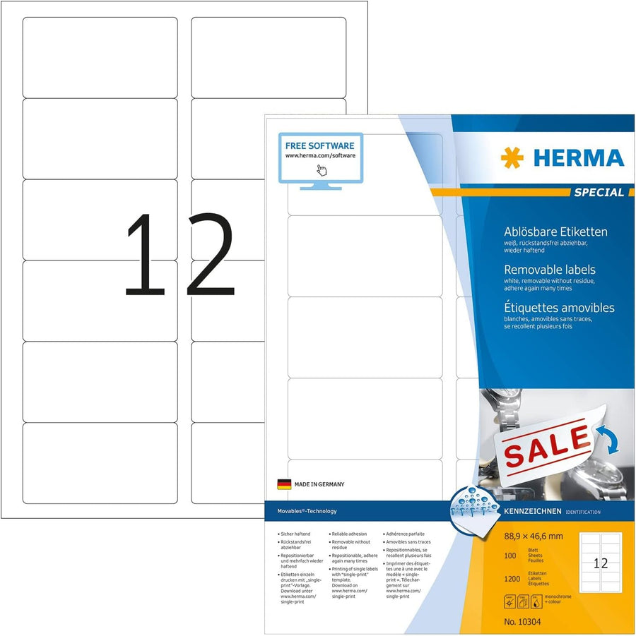 - Lieferumfang: 1200 x HERMA Ablösbare Etiketten, A4 Format, 8,89 x 4,66 cm, rechteckig, weiss (100 Blatt je 12 Etiketten)