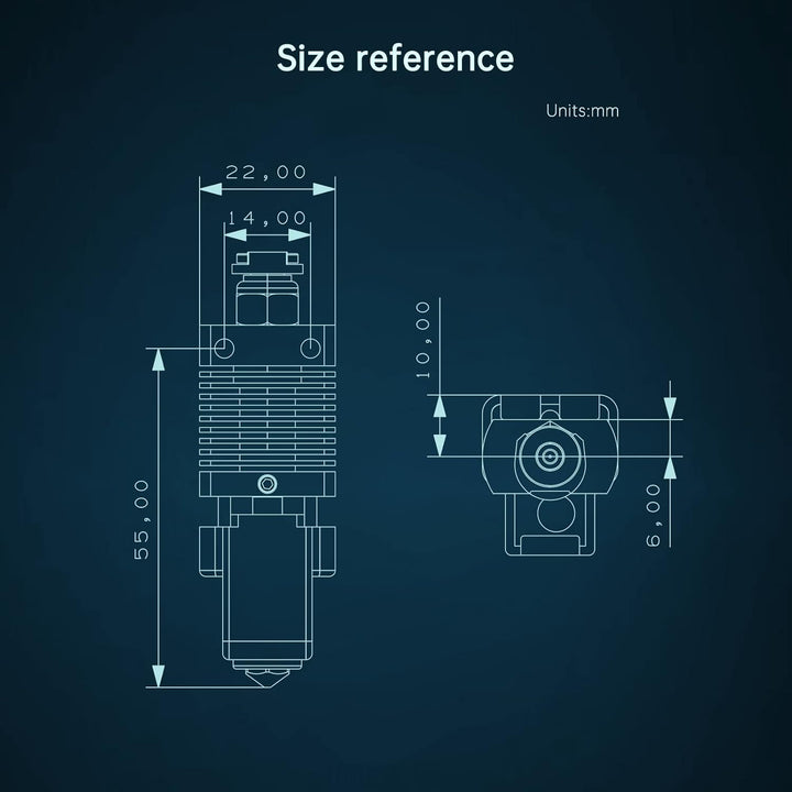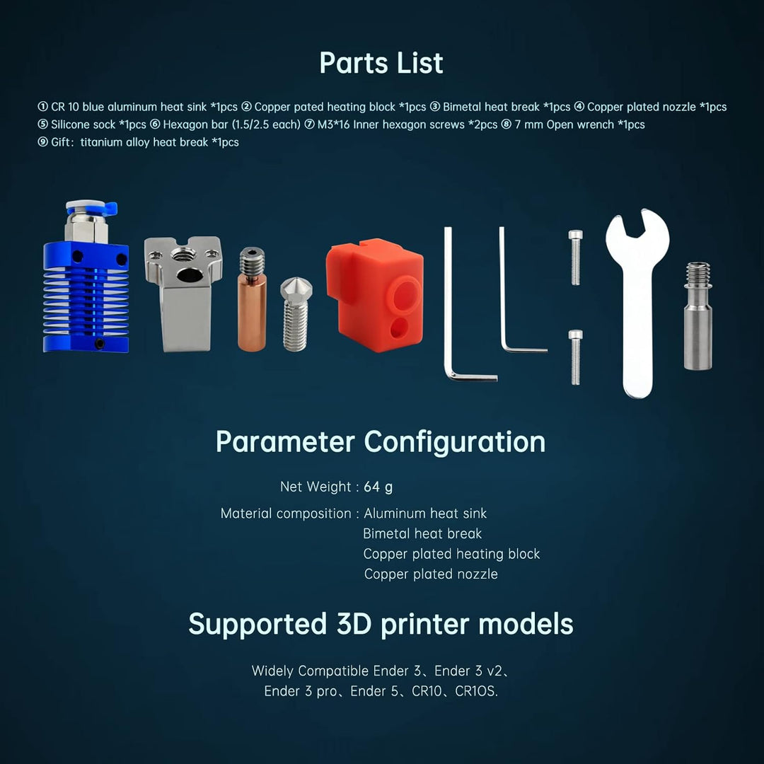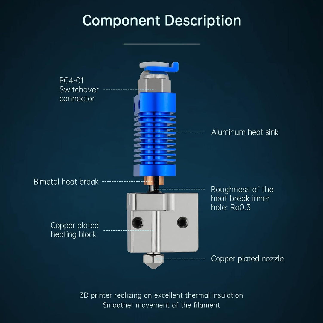 - Heizblock und 0,4 mm Düse sind aus hochwertigem Kupfermaterial mit Oberflächenvernickelung, zugelassen bis 550 °C für selbst die anspruchsvollsten Aufgaben, kompatibel mit allen Filamenten, von einfachen PLAs bis hin zu massgeschneiderten