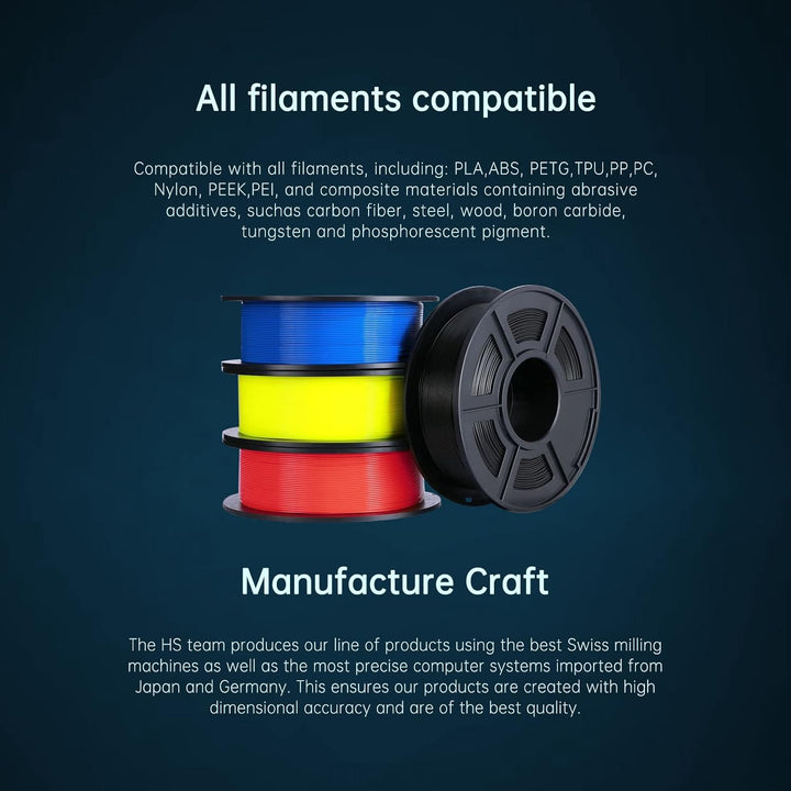 - Heizblock und 0,4 mm Düse sind aus hochwertigem Kupfermaterial mit Oberflächenvernickelung, zugelassen bis 550 °C für selbst die anspruchsvollsten Aufgaben, kompatibel mit allen Filamenten, von einfachen PLAs bis hin zu massgeschneiderten