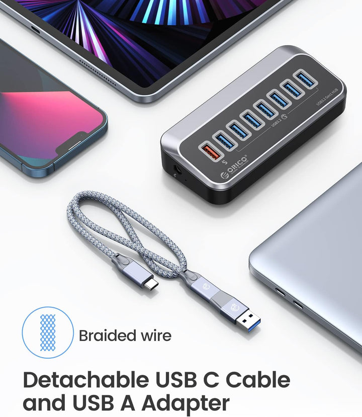 - ❤️Stabiler tragbarer USB 3.2 Hub mit abnehmbarem USB-C Kabel 0.5M, 12V/3A Netzteil und USB-A Adapter, der es eine gute Wahl für Laptop macht. Stecken Sie ein und gehen Sie, keine zusätzliche Softwareinstallation erforderlich Anschlüsse Es ist