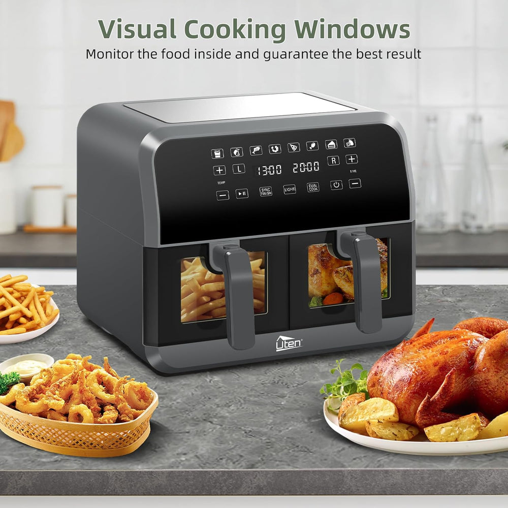 - 【Gesunde Ernährung】 Im vergleich zu herkömmlichen kochmethoden kocht die uten air fryer mit heisser luft und dem eigenfett der lebensmittel und benötigt nur eine kleine menge öl, um die mahlzeit fertigzustellen, wodurch ihre fettaufnahme um 75 %