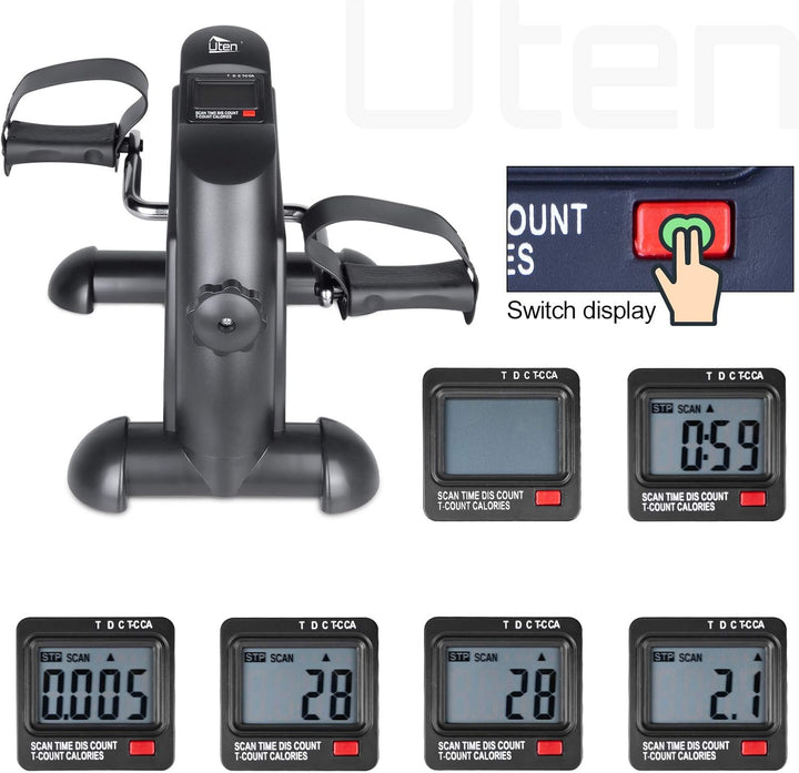 - LCD-Display: Die LCD-Computer dem mini Heimtrainer Trainingsgerät zeigen 4 Werte deutlich an: Trainingszeit, verbrauchte Kalorien, Zyklen und Umdrehungen pro Minute (U/min) und verbrannte Kalorien, und es enthält auch eine Scan-Funktion, die alle Messungen in der Reihenfolge anzeigt