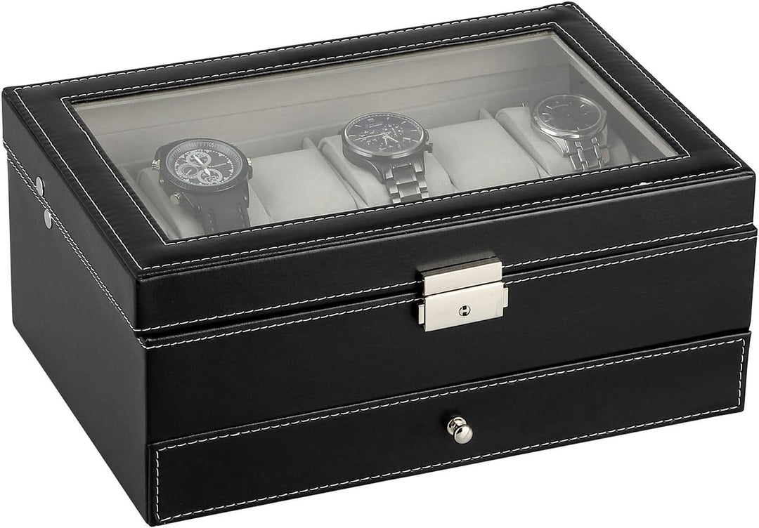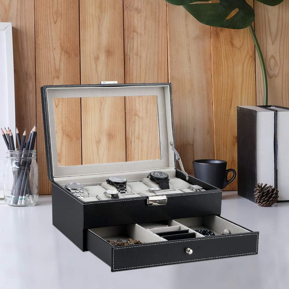 - DOPPELSCHICHT-DESIGN: In der oberen Uhrenbox Slots mit abnehmbaren Samtkissen ist für Uhren. In der unteren Schublade bringt Gläser, Ring, Armband, Halskette u.s.w in Ordnung. Es ist sehr bequem mit Schubladendesign