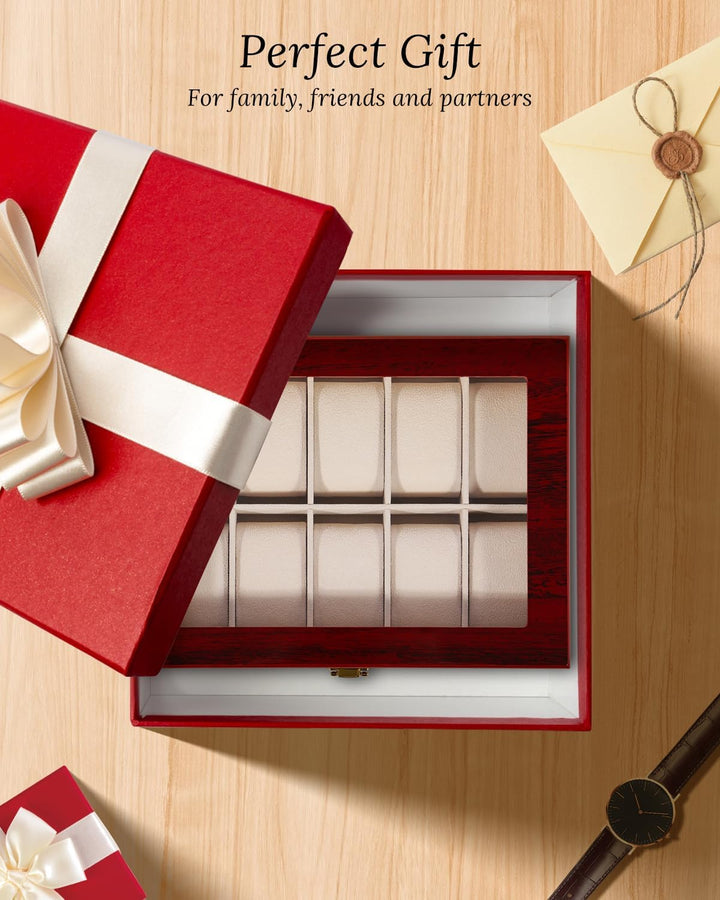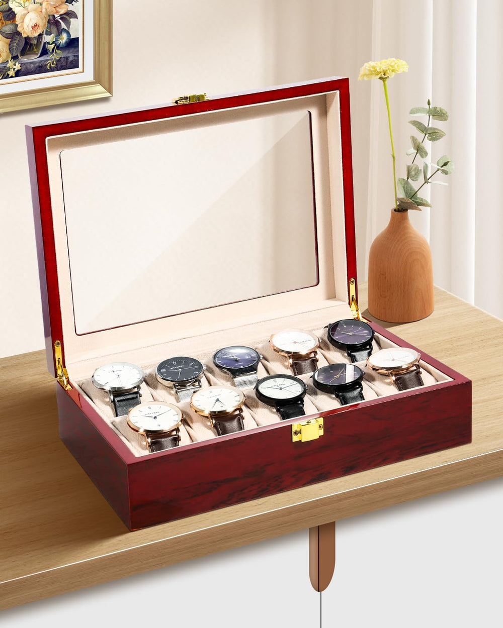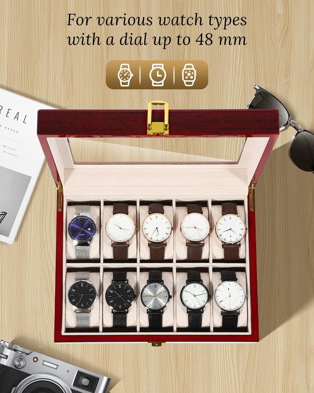- 【Uhrenbox Mit Grosser Kapazität 】:Unsere Uhrenbox mit 10 grossen Schlitzen, passt zu den meisten Grössen und Stilen von Uhren, wie grosse und kleine Uhren, Damen und Herrenuhren. Sie können es auch verwenden, um Schmuck wie Halskette und Armband