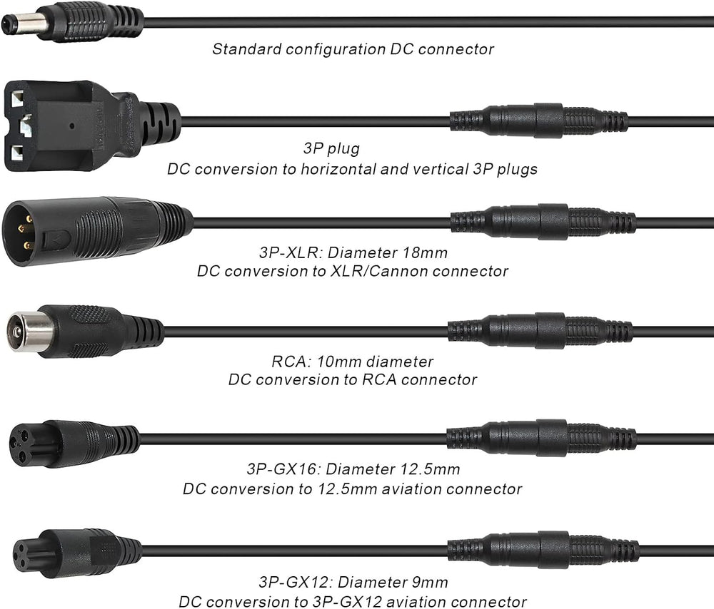 - [Produktinformation] Das Ladegerät kommt mit einer Verbindungsschnittstelle: Die DC 5.5*2.5MM Verbindungsschnittstelle ist auch für 5.5*2.1MM Grösse geeignet. - Anschlussschnittstellenkonvertierung: Dreiecksstecker,3P-XLR,RCA,3P-GX16,3P-GX12 mit