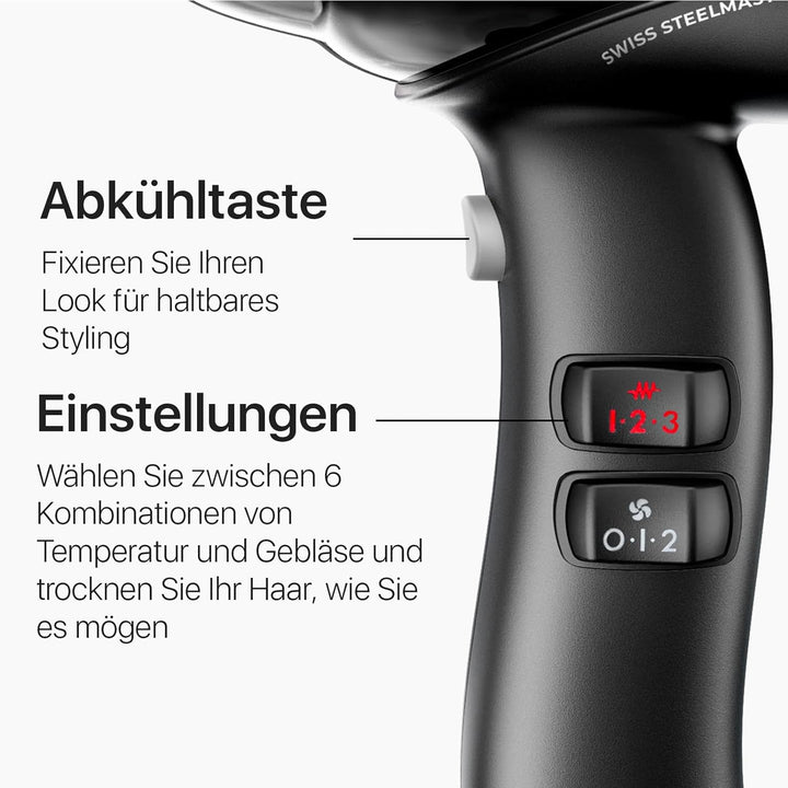 - IONEN-GENERATOR: Der leistungsstarke Ionen-Generator bringt die Haare ohne elektrostatische Aufladung zum Glänzen. Enthalten sind 6 Temperatur/Luftstrom-Schaltkombinationen und eine Abkühltaste