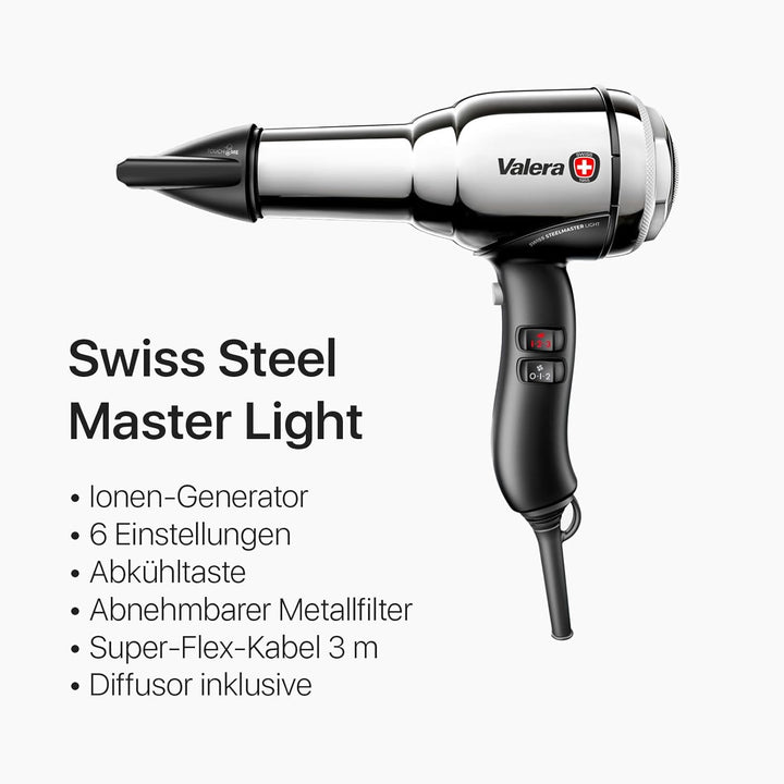 - HAARTROCKNER SWISS STEEL MASTER LIGHT: Der Profi-Haartrockner von Valera aus verchromtem Stahl: leistungsstark & leicht. Beinhaltet 1 Diffusor, 1 kühle TOUCH ME-Düse (7,5cm) und eine Schutztasche