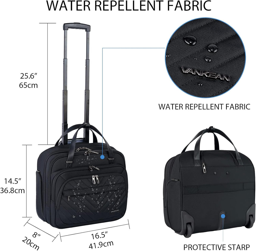 - DAUERHAFTES & BENUTZERFREUNDLICHES DESIGN: Die rollende Laptoptasche von VANKEAN verfügt über Metallreissverschlüsse, wasserdichte Bodenplatten, Eckschutzvorrichtungen und eine Trittplatte; der robuste Aluminium-Teleskopgriff eignet sich für Benutzer