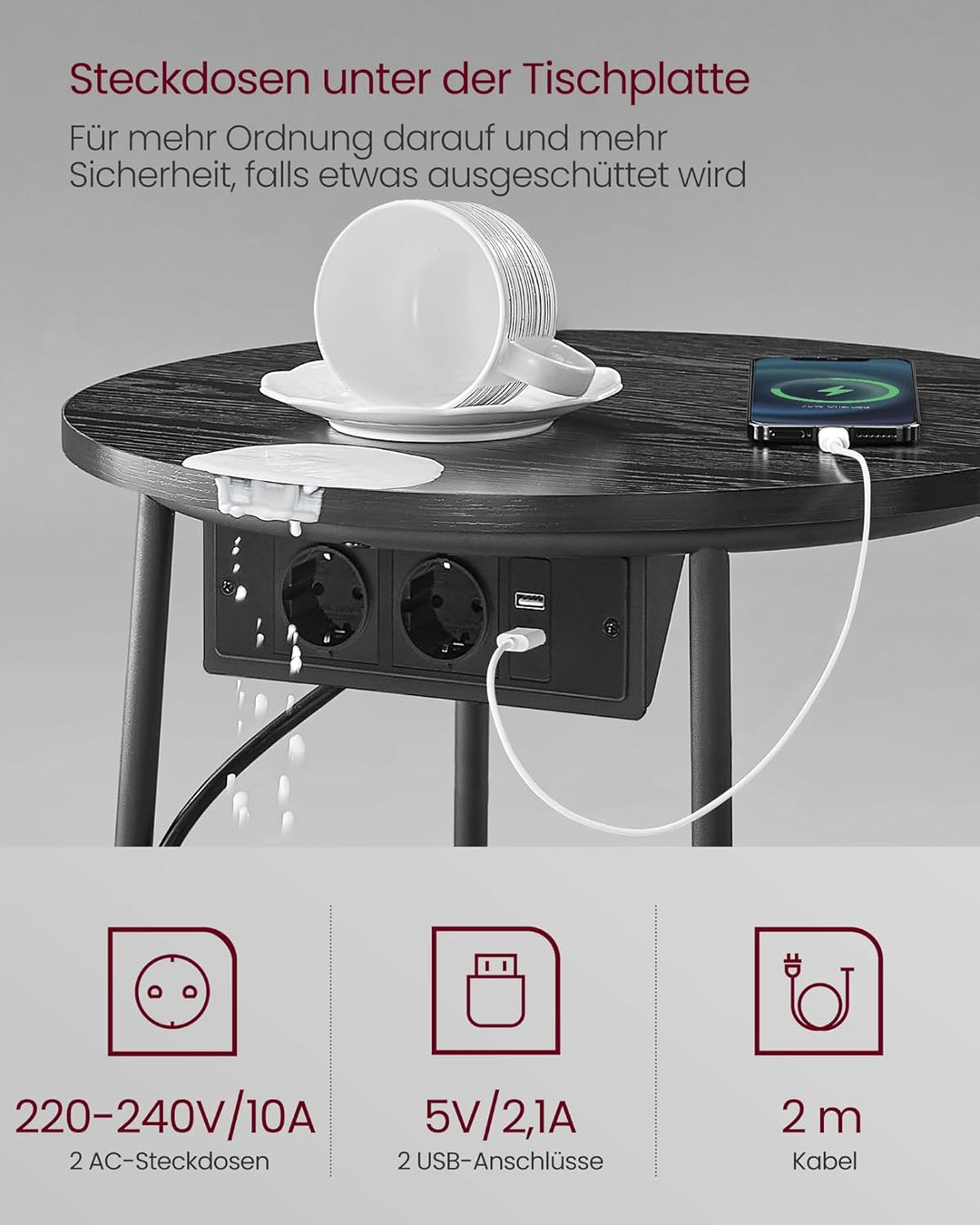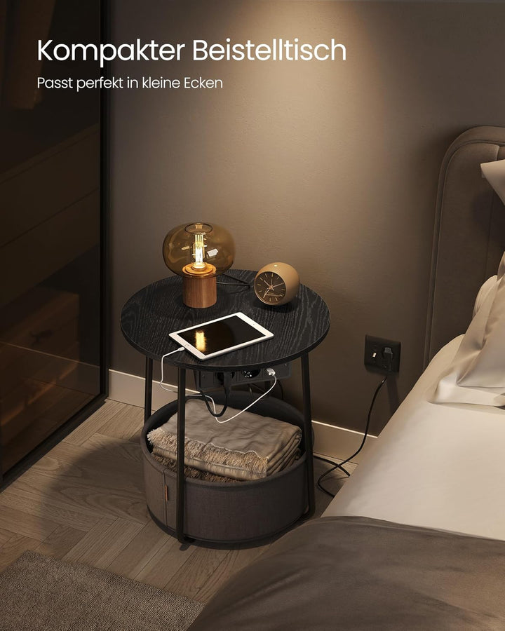 VASAGLE Beistelltisch rund, Kleiner Tisch, Couchtisch mit Steckdose, Wohnzimmertisch, Korb aus Stoff