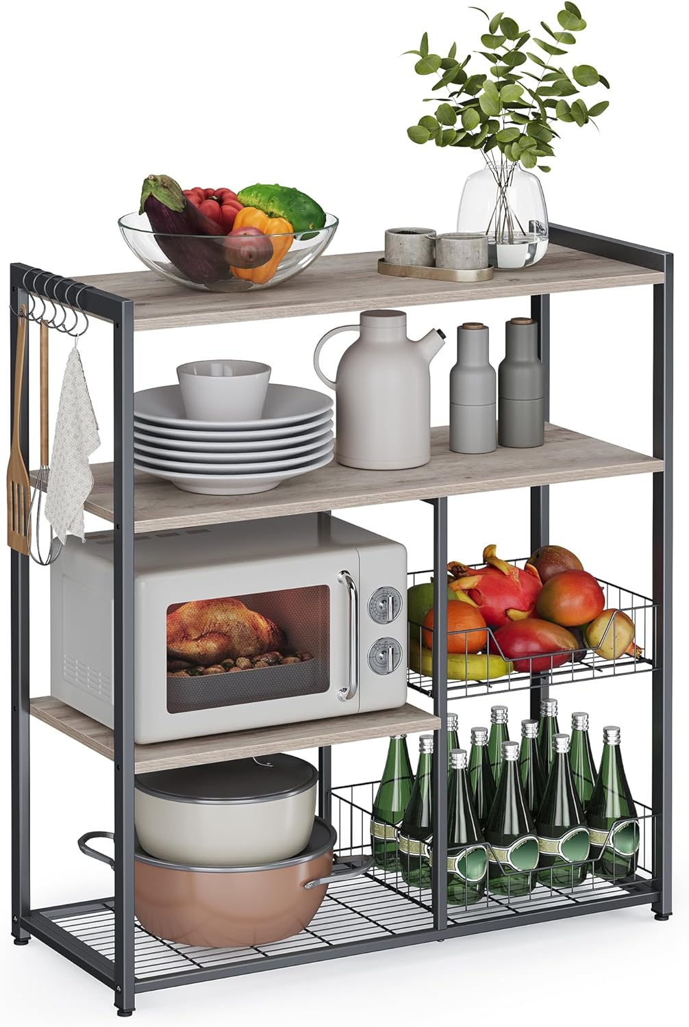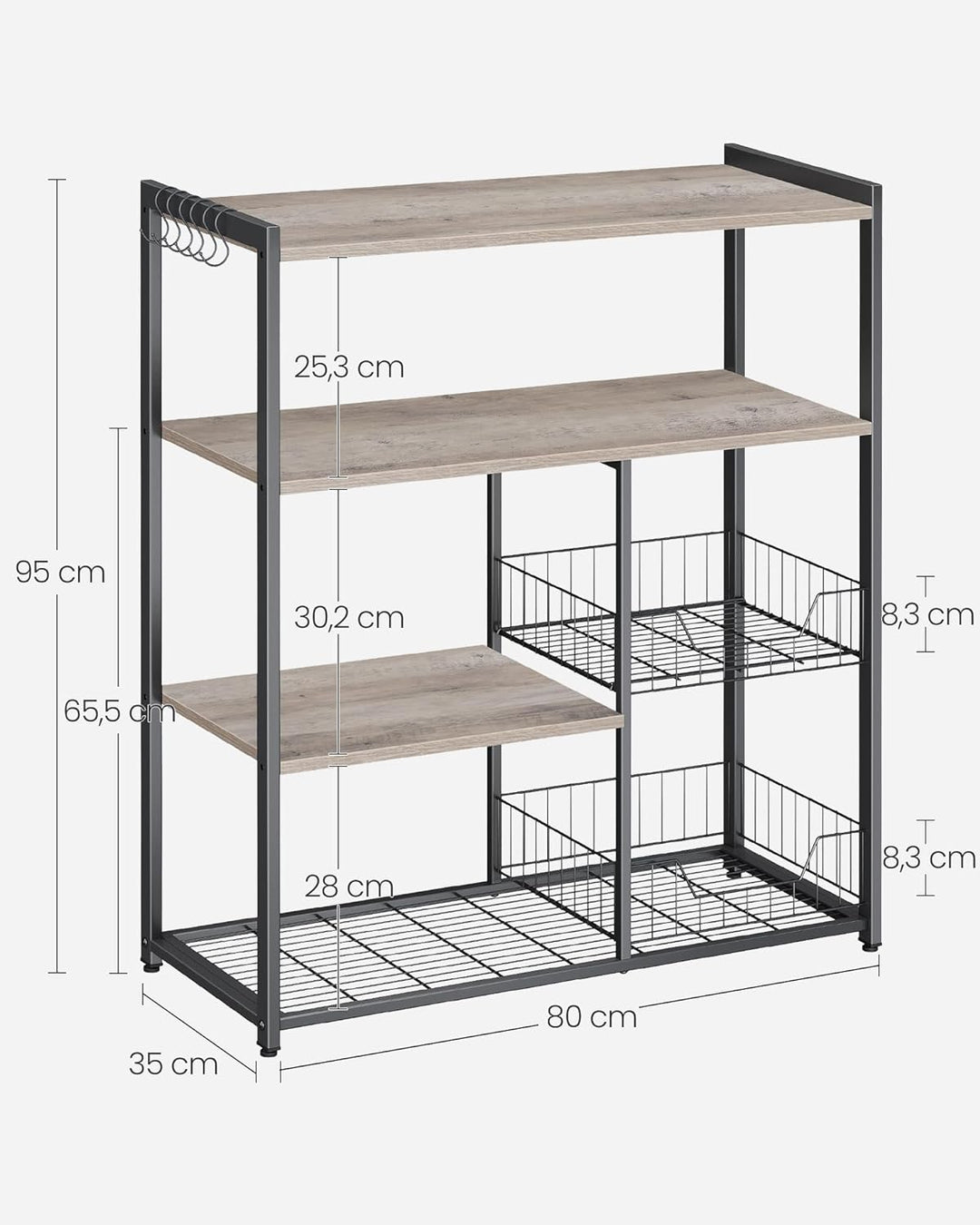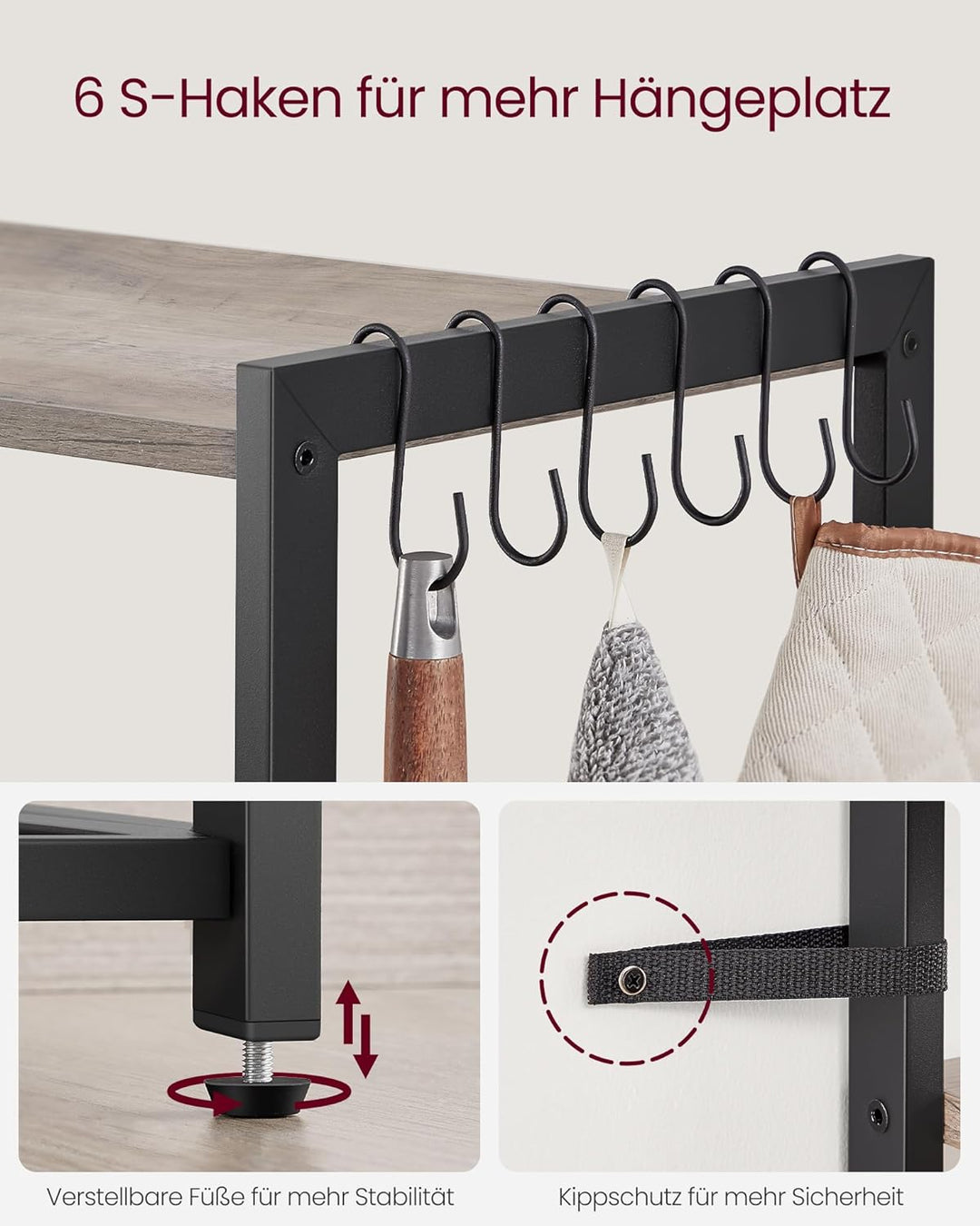 - [Ordnung schaffen] Ordnung in der Küche ist wichtig. Mit mehreren Ablagen für Dosen und Teller, 2 9 cm tiefen Gitterkörben für Obst und 6 Haken für Kochutensilien ausgestattet, unterstützt Sie dieses Regal perfekt bei der Zubereitung Ihrer