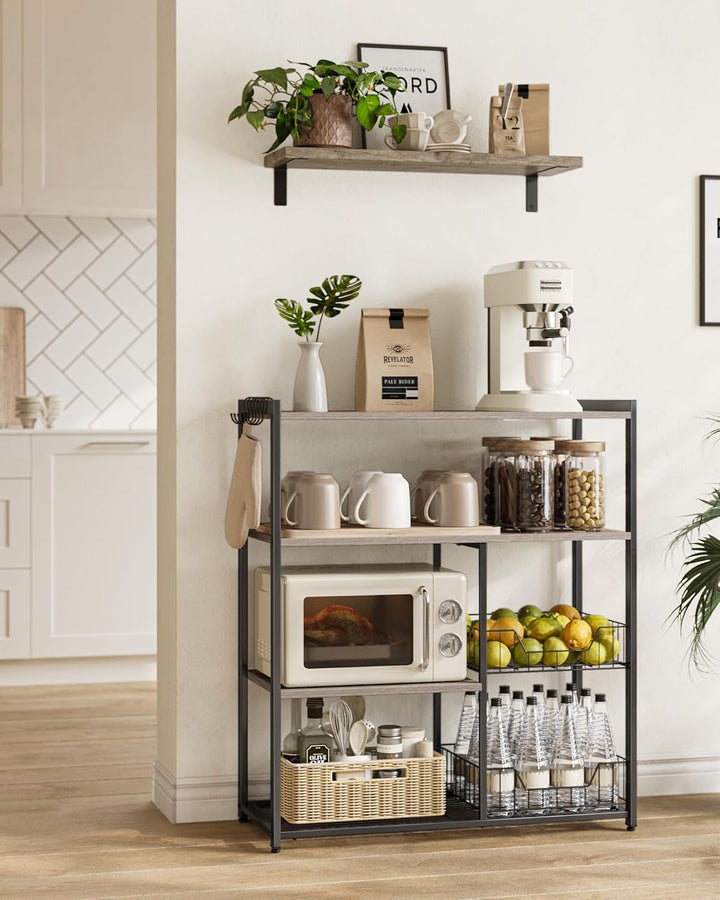 - [Reichlich Stauraum] Sie dürfen alle Elektrogeräte behalten! Dank der 35 cm tiefen Regalebenen, die in ausreichenden Abständen voneinander angebracht sind, finden Sie auf diesem Bäckerregal endlich einen gemeinsamen Platz für Toaster, Mikrowelle und