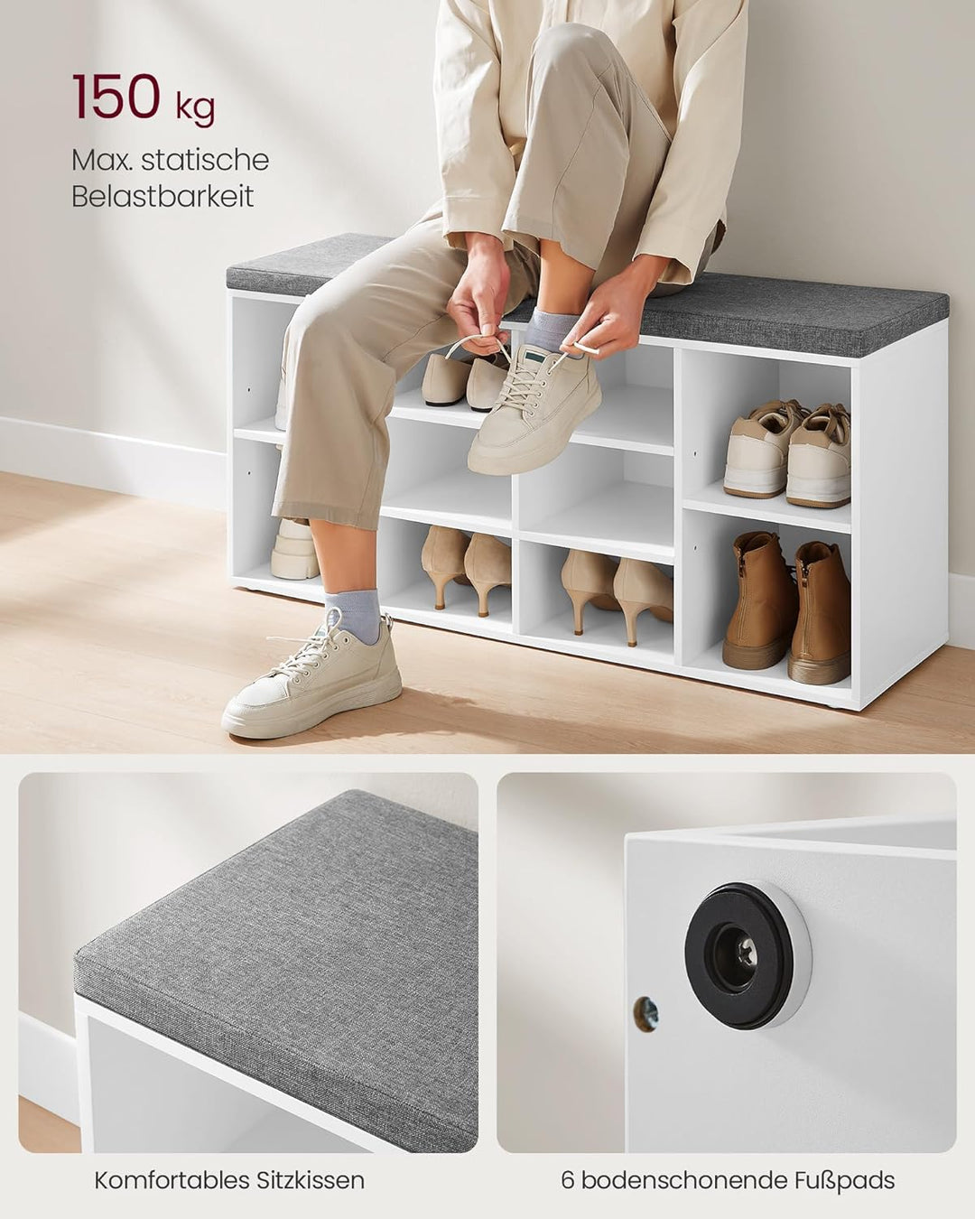 - [Nehmen Sie Platz] Geraten Sie beim Anziehen Ihrer Schuhe regelmässig aus dem Gleichgewicht? Setzen Sie sich bequem auf diese gepolsterte Schuhbank und binden Sie Ihre Schuhe mühelos zu. Die robuste Struktur aus Holzspanplatten ist mit bis zu 150 kg