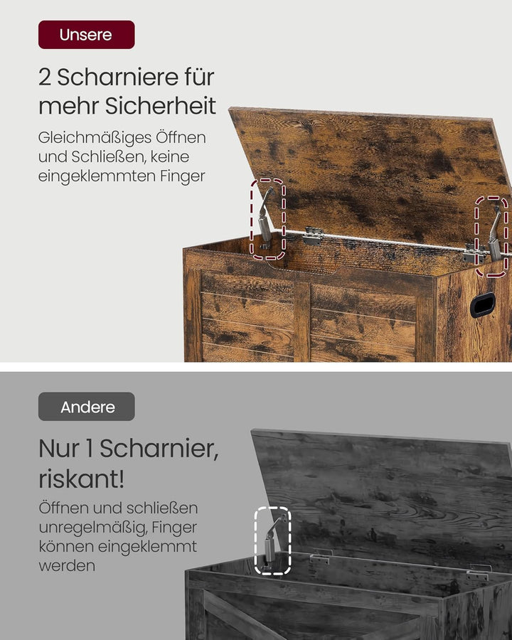 - [2 Sicherheitsscharniere, für mehr Sicherheit] Der Deckel ist mit zwei stabilen Scharnieren ausgestattet, die dafür sorgen, dass er in jedem Winkel geöffnet bleiben und sanft schliessen kann. So besteht keine Gefahr, dass Ihre Finger eingeklemmt werden